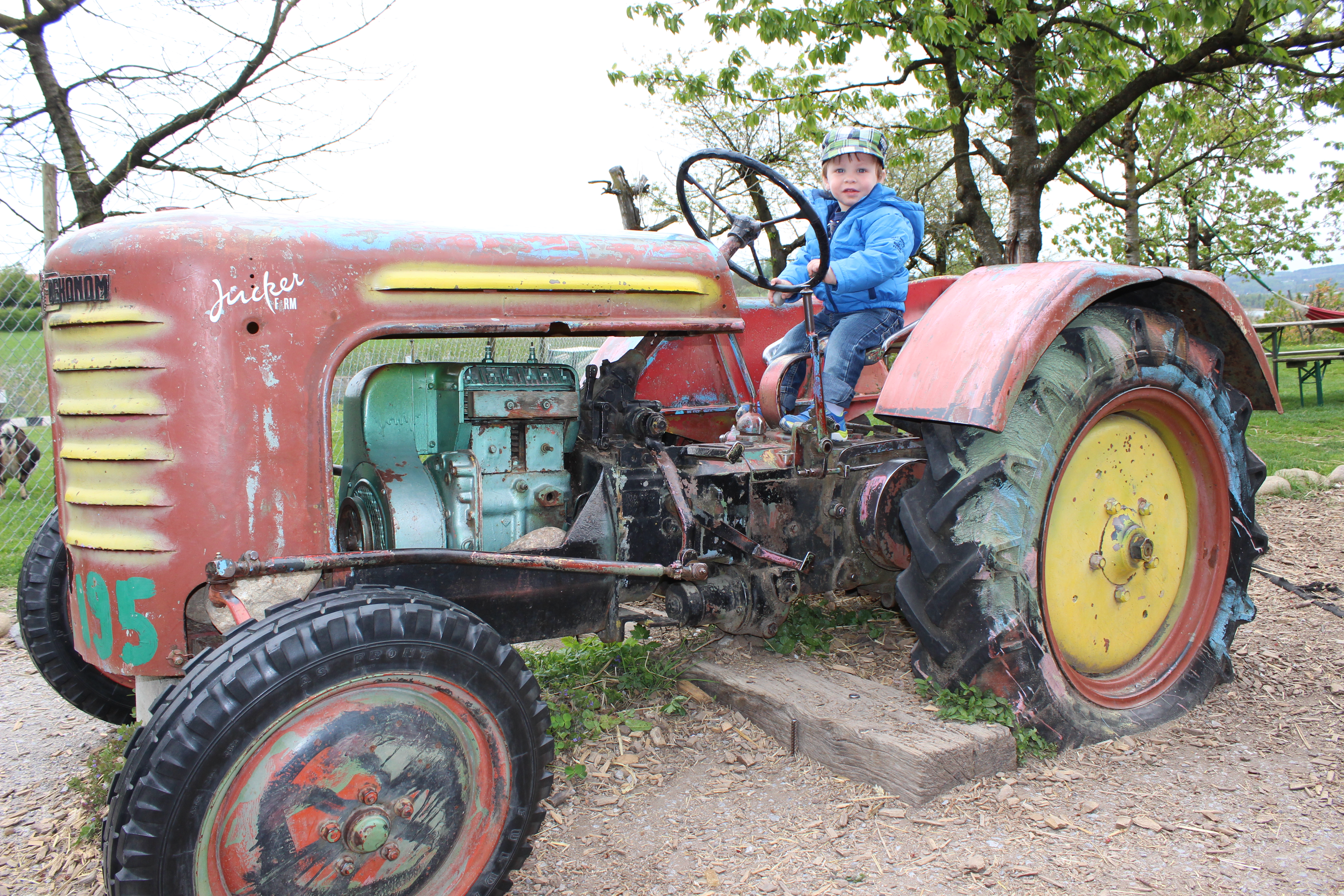 Der Traktor fährt zwar nicht, aber es ist schon aufregend, hier zu sitzen und am Steuerrad herumzudrehen.